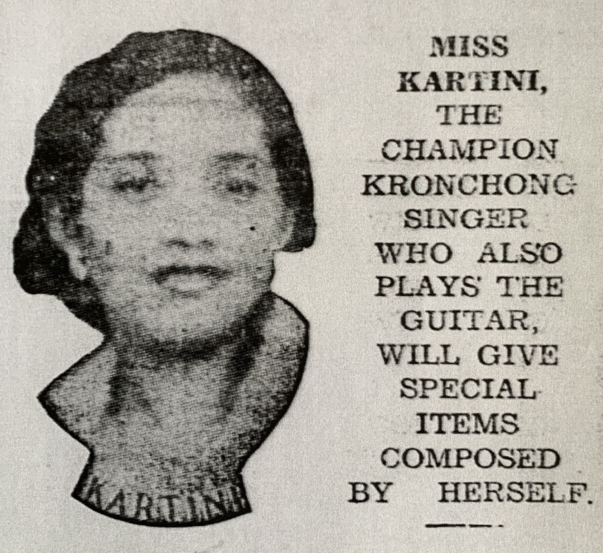 MISS KARTINI – The great favourite with all Singapore music lovers, whose melodious voice you heard recently with the Terang Bulan Kronchong Party at the New World. Records exclusively for ‘Chap Kuching.’ [Malaya Tribune, 27 July 1938, p.11]