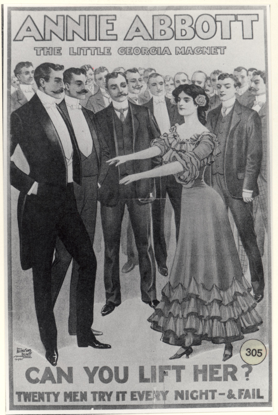 American girl from Georgia who performed under the name “The Little Magnet.” Her act was promoted as “the greatest phenomenon since the Christian era. Two Hours of inexplicable mystery. Food for thought. What is this mighty force that overcomes physical strength and baffles the scientific world?” [The Straits Maritime Journal, 22 January 1896, p.4]