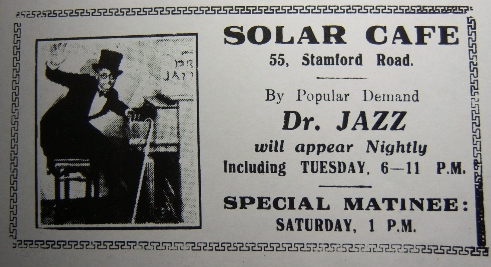 Malaya Tribune, 11 July 1931, p.10 – “Dr. Jazz At The Solar Cafe”