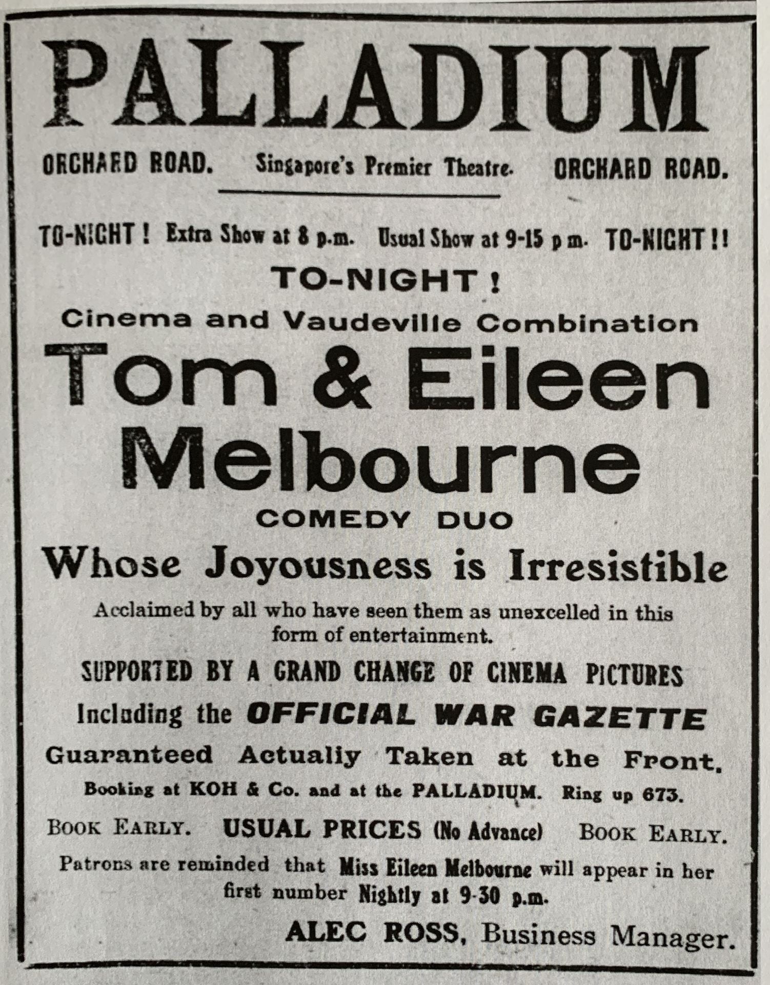 Palladium: Tom & Eileen Melbourne.Singapore Free Press, June 19, 1915, 1. Retrieved from NewspaperSG.