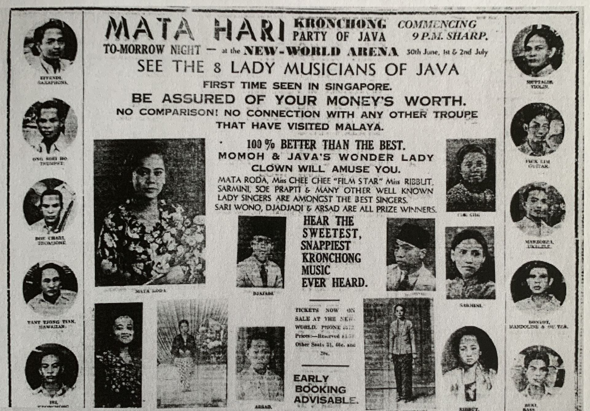 MATA HARI KRONCHONG PARTY OF JAVA – What promises to be one of the best Kronchong Parties from Java to have visited Malaya will be seen at the New World Arena tomorrow night… For the first time in Malaya, eight Java ladies will be seen handling musical instruments. They will render selections. Amongst some of the leading singers of Batavia, Bandoeng, and Sourabaya are Miss Che Che, Mata Roda, Lim Sam Neo, Miss Ribbut, Miss Sarmini, Miss Yeti, Miss Bandoeng, Mr. Djajadi, Warming together with four others. Most of the singers are winners of various competitions held in Pasir Gambiar etc. Little Boy Arsad is the only lad in Java who competed against grown-ups and won a prize. A feature of the show will be the appearance of musicians who were specially chosen from some of the well-known musical parties in Java including the Three Bass Wonders. [Malaya Tribune, June 29, 1939, p. 7]