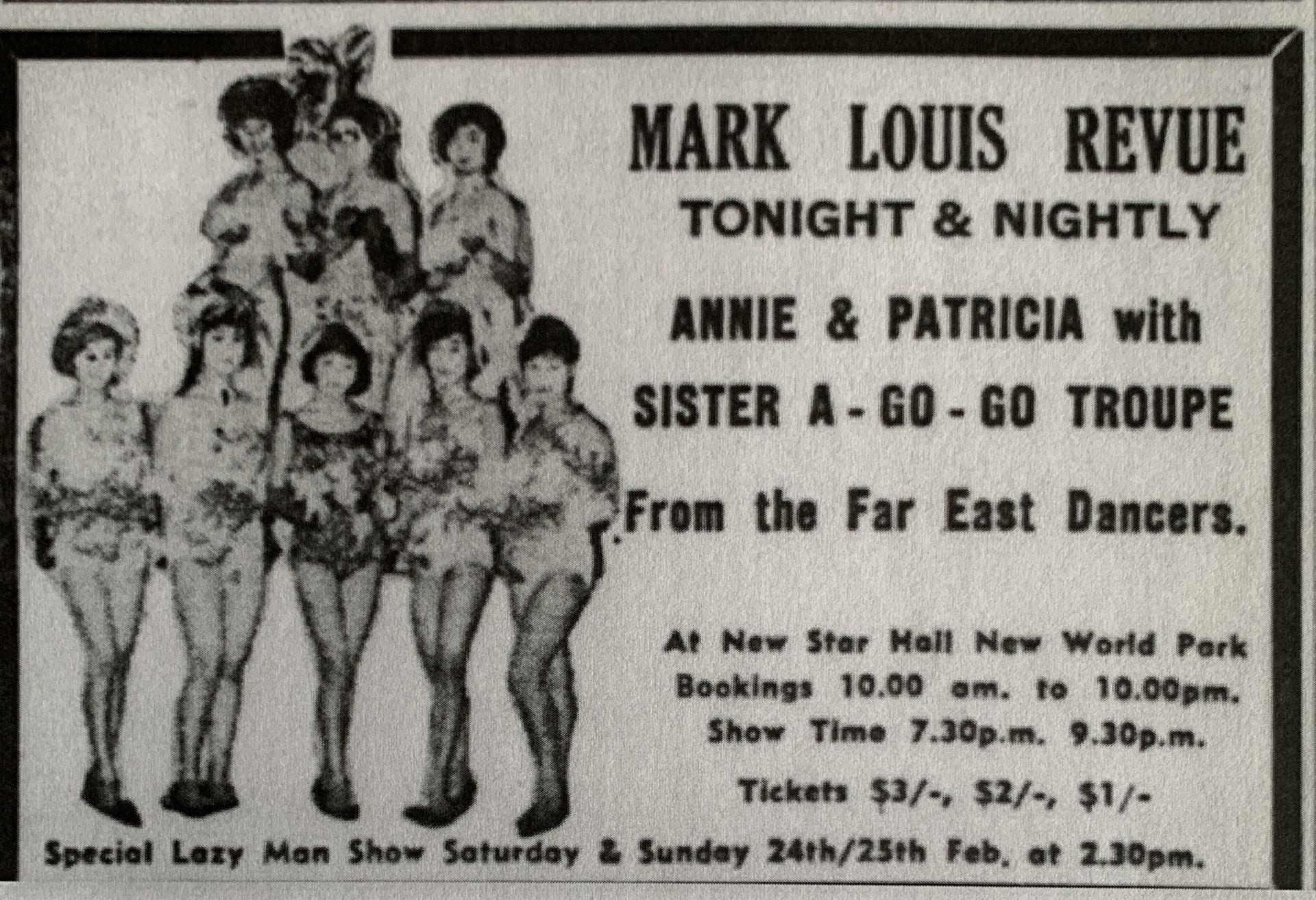 POLICE PUT CURTAINS TO REVUE – Some 700 people who had purchased tickets for this afternoon’s “Mark Louis Show” at the New World Amusement Park were disappointed when they were told that the revue was off. Reason for this was that the police had refused to renew the licence for the show scheduled from 2.30 p.m. to 4 p.m. at the park’s New Star Hall. Said a distraught Mr. Mark Louis that afternoon: “I was shocked when I received a letter from the police turning down my weekly application for renewal of our weekend matinee shows just before today’s matinee was due to start.”