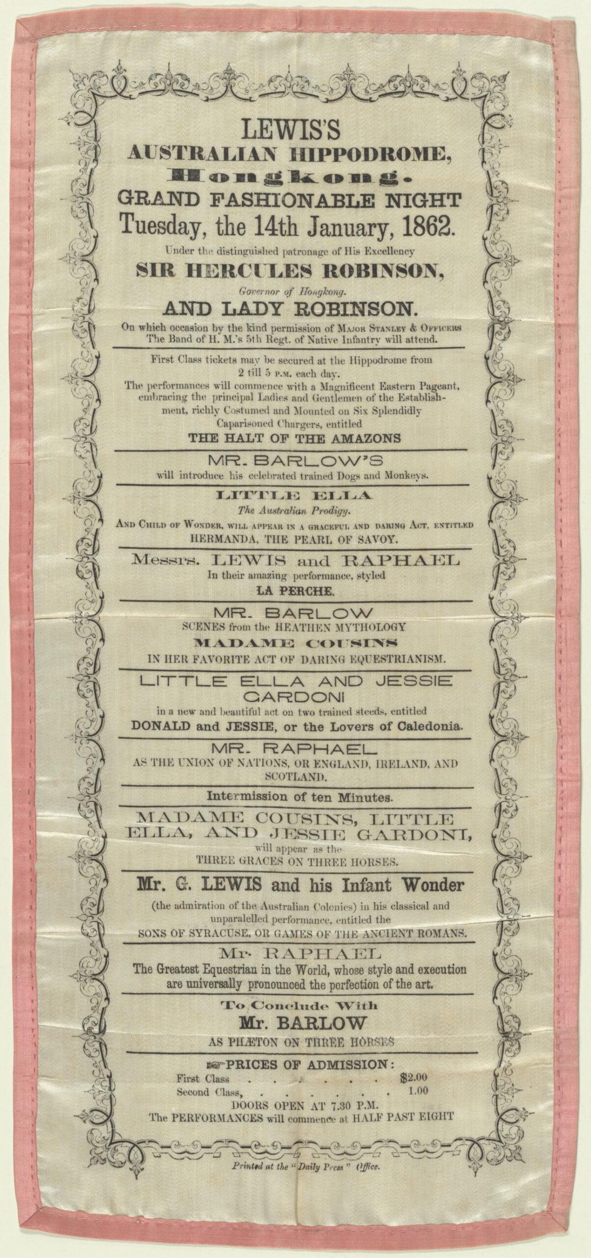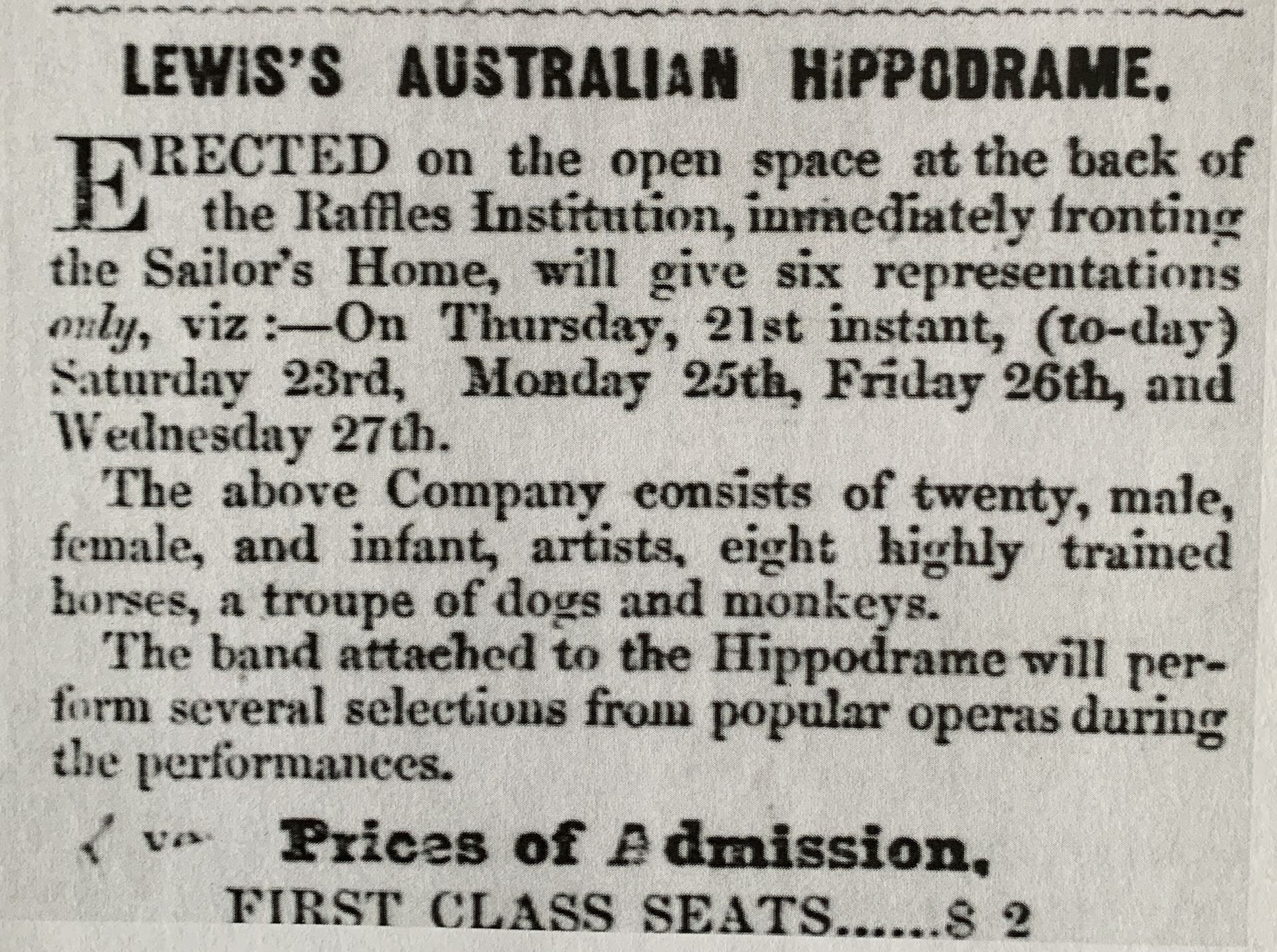 In 1866 a troupe named “Mr. Cousin’s Australian Hippodrome” came to Singapore. It is not known if there was any connection with Mr. Lewis’ Australian Hippodrome.