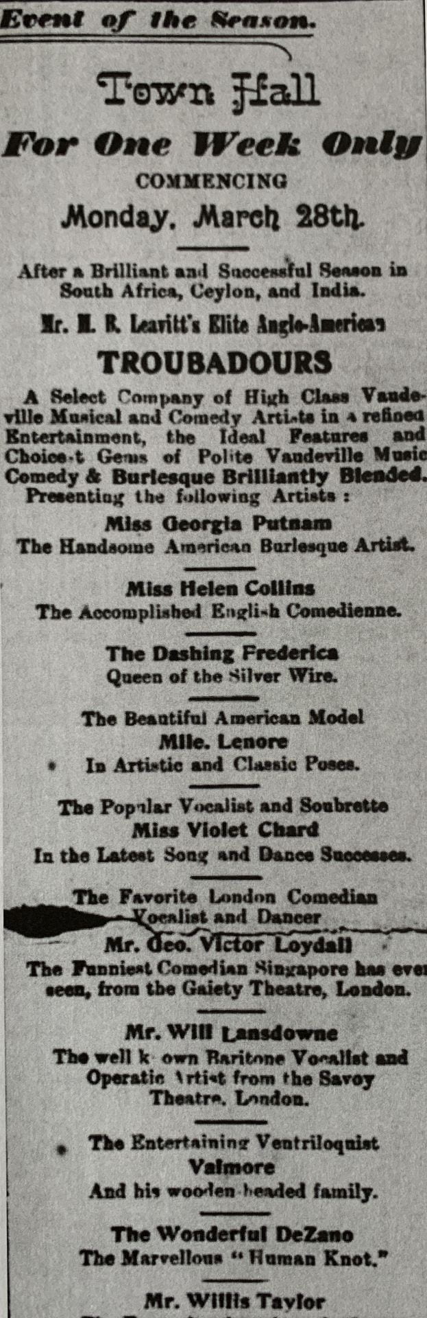EVENT OF THE SEASON – Town Hall for one week only – After a brilliant and successful season in South Africa, Ceylon & India – Mr. M. B. Leavitt’s Elite Anglo-American TROUBADOURS – A select company of high-class vaudeville, musical and comedy artists in a refined entertainment, the ideal features and choicest gems of polite vaudeville, music, comedy & burlesque brilliantly blended – Presenting the following artists: Miss Georgia Putnam, the handsome American burlesque artist; Miss Helen Collins, the accomplished English comedienne; the dashing Frederica, Queen of the Silver Wire; the beautiful American model Mlle. Lenore in artistic and classic poses; the popular vocalist & soubrette Miss Violet Chard in the latest song & dance successes; the favourite London comedian, vocalist & dancer Mr. Geo. Victor Loydall, “the funniest comedian Singapore has ever seen,” from the Gaiety Theatre, London; Mr. Will Lansdowne, the well-known baritone vocalist and operatic artist from the Savoy Theatre, London; the entertaining ventriloquist Valmore and his “wooden-headed family”; the wonderful De Zano, “the marvellous human knot”; Mr. Willis Taylor, the favourite American author, composer & pianist – “An evening’s enjoyment of frivolity, jollity & fantasy – everything new, bright and up-to-date.” As an extra attraction Mr. Leavitt had added the world-famous Mysterious Zancigs, who would nightly appear in their wonderful entertainment of mental telepathy – “The strongest, most novel and attractive entertainment ever seen in Singapore.” [Straits Times, March 24, 1904, p. 4]